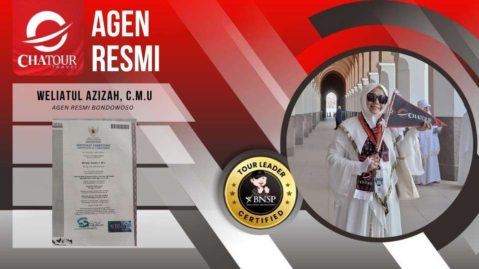 Bondowoso, Chatour Travel – Masyarakat di wilayah Bondowoso yang sedang merencanakan ibadah Umrah kini mendapatkan jaminan layanan yang lebih profesional. Chatour Travel memperkuat kehadirannya di Bondowoso dengan menempatkan agen resmi yang dikelola langsung oleh praktisi bersertifikasi kompetensi nasional dari BNSP (Badan Nasional Sertifikasi Profesi) sebagai Tour Leader.