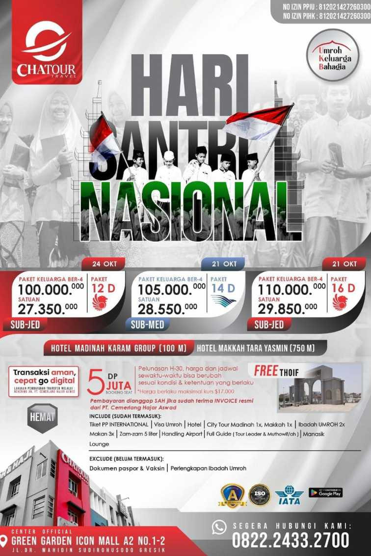 Gresik, Chatour Travel – Kabar gembira bagi keluarga yang sedang merencanakan ibadah ke Tanah Suci pada musim umrah 1448 H. Chatour Travel sebagai pelopor Umrah Hari Santri untuk keempat kalinya telah meluncurkan program unggulan "Umrah Keluarga Bahagia" melalui paket promo Hari Santri Nasional (HSN) dengan Rp100 juta bisa umrah berempat. Program ini menjadi jawaban atas tingginya biaya perjalanan umrah belakangan ini. Dengan skema ini, biaya per jemaah hanya jatuh di angka Rp25 juta, dengan harga yang sangat terjangkau Chatour Travel tetap memberikan fasilitas dan pelayanan terbaik.