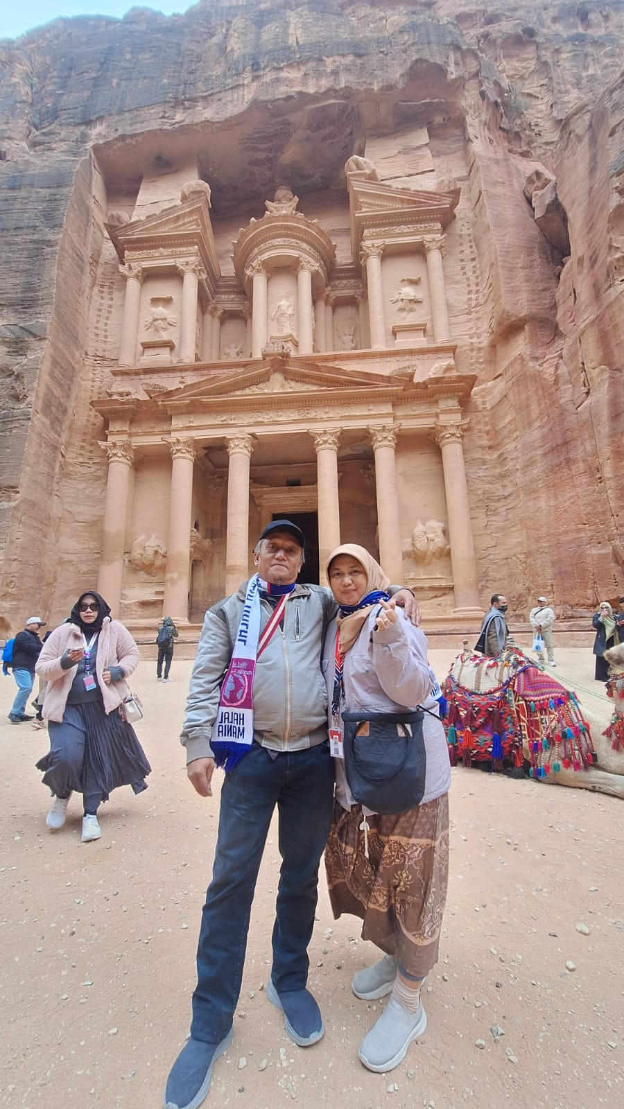 Kemegahan Kota Batu Petra: Dalam dokumentasi perjalanan, terlihat jamaah tiba di gerbang utama dengan sambutan tulisan "Welcome to Petra". Mereka juga mengabadikan momen di depan Al-Khazneh, bangunan ikonik yang dipahat langsung di dinding tebing batu merah Yordania yang megah.
