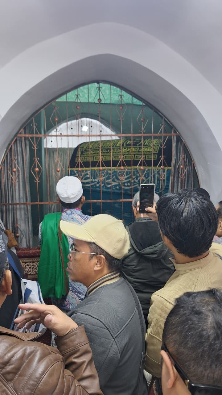 Ziarah ke Makam Nabi Yunus AS: Salah satu momen paling syahdu adalah saat jamaah mengunjungi makam Nabiyullah Yunus AS. Suasana khusyuk terlihat saat jamaah berkumpul di depan pusara yang tertutup kain hijau bertuliskan kaligrafi, memanjatkan doa dan merenungi kisah keteguhan hati sang nabi.