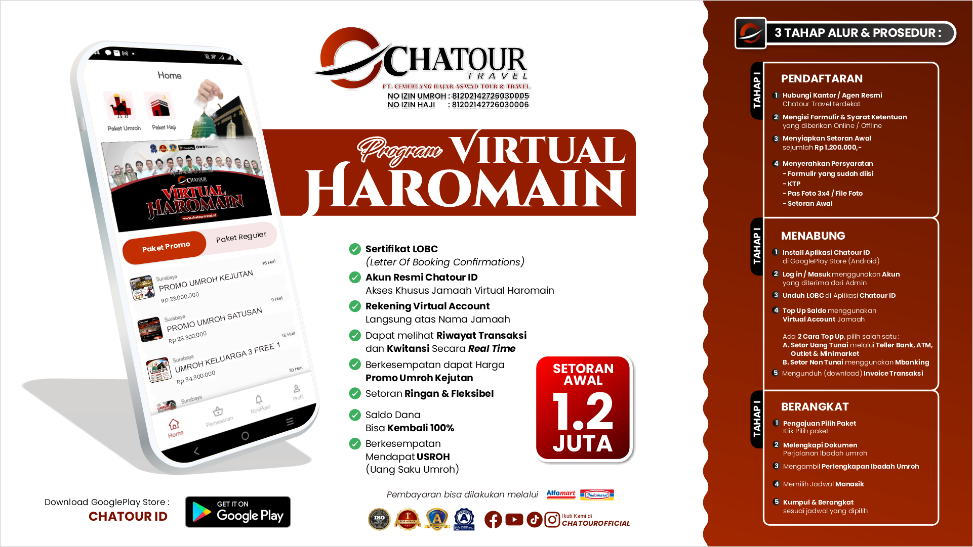Memahami kebutuhan masyarakat akan perencanaan yang aman dan terukur, Chatour Travel yang telah berpengalaman selama 18 tahun dan memberangkatkan puluhan ribu jemaah, menghadirkan inovasi melalui Chatour Virtual Haromain.