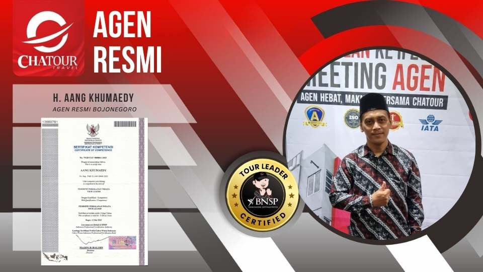 Bojonegoro, Chatour Travel – Rencana perjalanan ibadah ke Tanah Suci bagi masyarakat Bojonegoro kini menjadi lebih terjamin dengan hadirnya pendampingan dari tenaga ahli profesional, agen resmi Chatour Travel di Bojonegoro. Chatour Travel memperkuat pelayanannya di wilayah Bojonegoro dengan menempatkan dua perwakilan resmi yang telah memiliki sertifikasi kompetensi nasional dari Badan Nasional Sertifikasi Profesi (BNSP) sebagai Tour Leader. Langkah ini dilakukan untuk menjawab kebutuhan jamaah akan transparansi informasi dan bimbingan ibadah yang kredibel, langsung dari praktisi yang berpengalaman mengawal jamaah di lapangan.