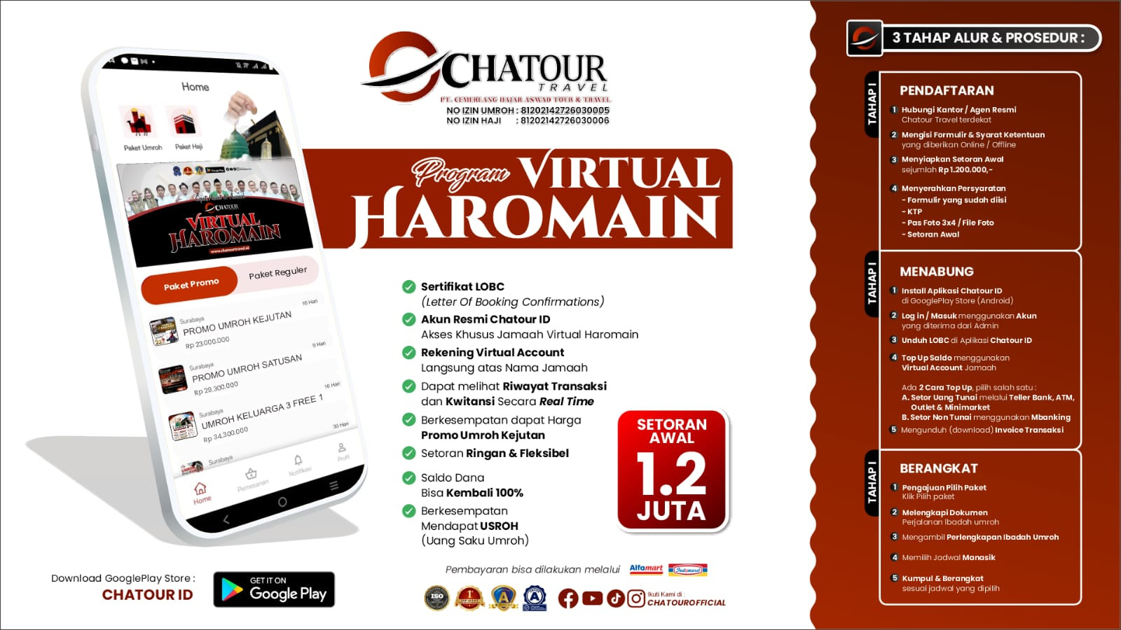 Chatour Virtual adalah sistem tabungan berbasis aplikasi Chatour.id yang memudahkan masyarakat menabung secara mandiri untuk umroh dan haji.