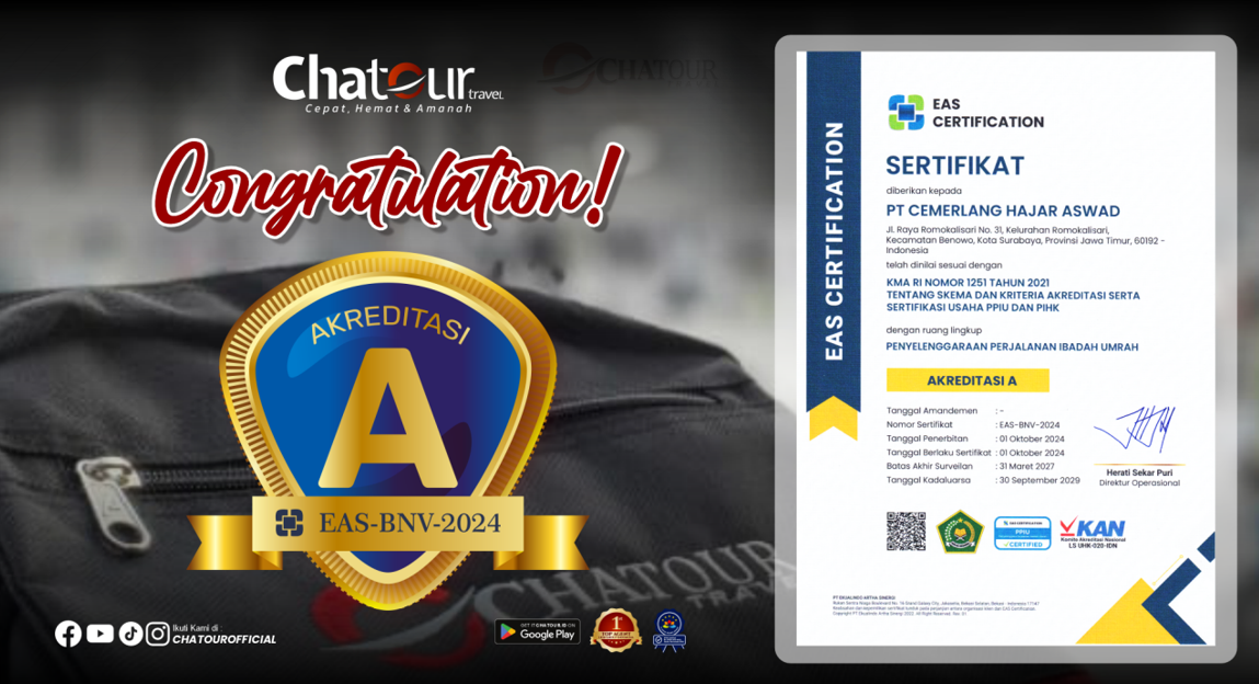 Sertifikat Akreditasi A yang diperoleh melalui badan usaha PT Cemerlang Hajar Aswad diberikan berdasarkan pemenuhan standar KMA RI Nomor 1251 Tahun 2021 tentang penyelenggaraan perjalanan ibadah Umrah. Akreditasi tersebut berlaku hingga 2029 dan menjadi bukti kepatuhan Chatour Travel terhadap regulasi nasional serta standar layanan yang ditetapkan pemerintah.