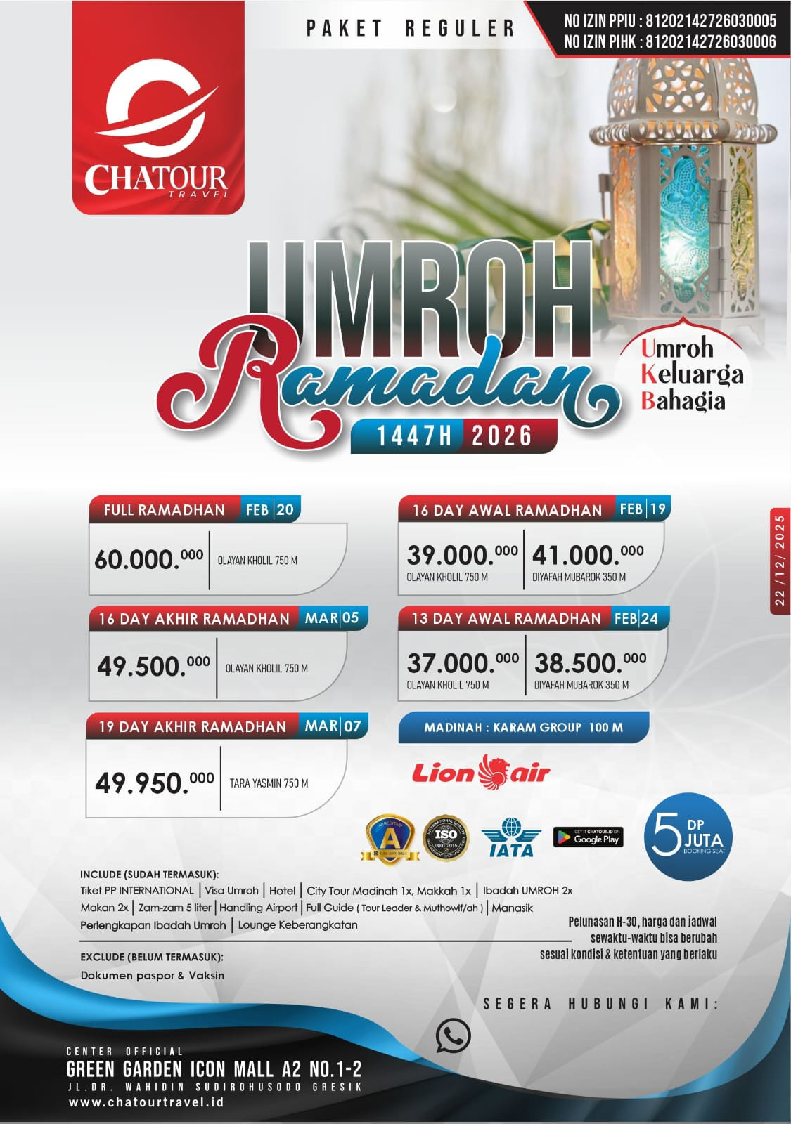 Chatour Travel merupakan Penyelenggara Perjalanan Ibadah Umrah (PPIU) dan Penyelenggara Ibadah Haji Khusus (PIHK) resmi Izin Umroh : 81202142726030005 dan Izin Haji : 81202142726030006, dengan rekam jejak panjang dalam melayani jamaah dari berbagai daerah di Indonesia. Berbasis di Gresik, Jawa Timur, Chatour Travel dikenal memiliki sistem pelayanan profesional, jaringan agen resmi yang luas, serta komitmen tinggi terhadap keamanan, kenyamanan, dan bimbingan ibadah jamaah. Setiap program Umrah, termasuk Umrah Ramadhan, dirancang tidak hanya sebagai perjalanan, tetapi sebagai proses pembinaan spiritual yang terarah.