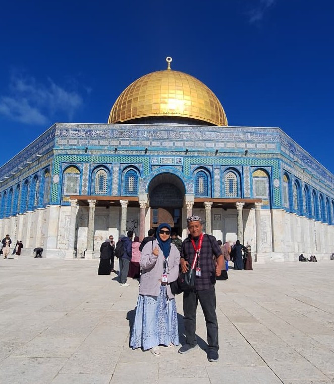 Kebahagiaan jamaah semakin lengkap saat mereka berkesempatan menunaikan Salat Jumat berjamaah di Masjidil Aqsa. Dokumentasi menunjukkan pasangan jamaah tampil serasi dengan atribut Chatour Travel di depan Dome of the Rock (Kubah Shakhrah) yang ikonik dengan kubah emasnya yang berkilau di bawah langit biru yang cerah.