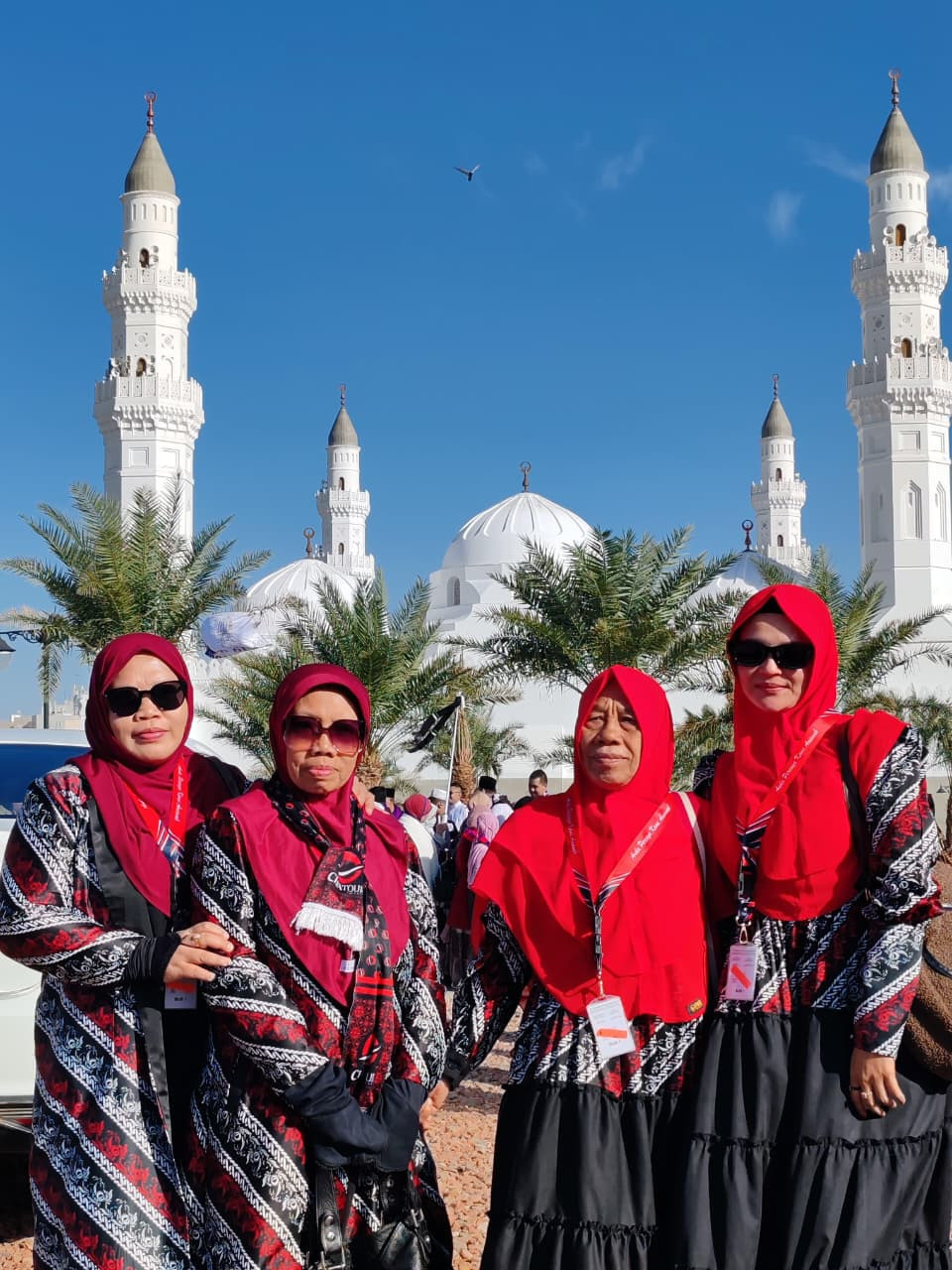 Momen Bu Riska dan teman-teman di depan Masjid Quba/Foto: Dokumentasi tim Mecha